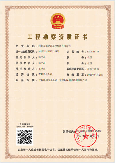 我公司自成立起即取得河北省建设厅颁发的建设工程质量检测机构资质证书和河北省市场监督管理局颁发的检验检测机构资质认定证书;经过多年持续不断的发展提升,目前建设工程质量检测资质为综合资质;资质认定能力包括地基基础检测、室内环境检测、室内装饰装修材料有害物质检测、基坑工程、隧道工程、建筑结构工程、土工试验、建材检测、钢结构检测、水质分析、建筑门窗、建筑节能检测等420余个检测参数。
