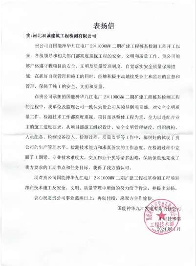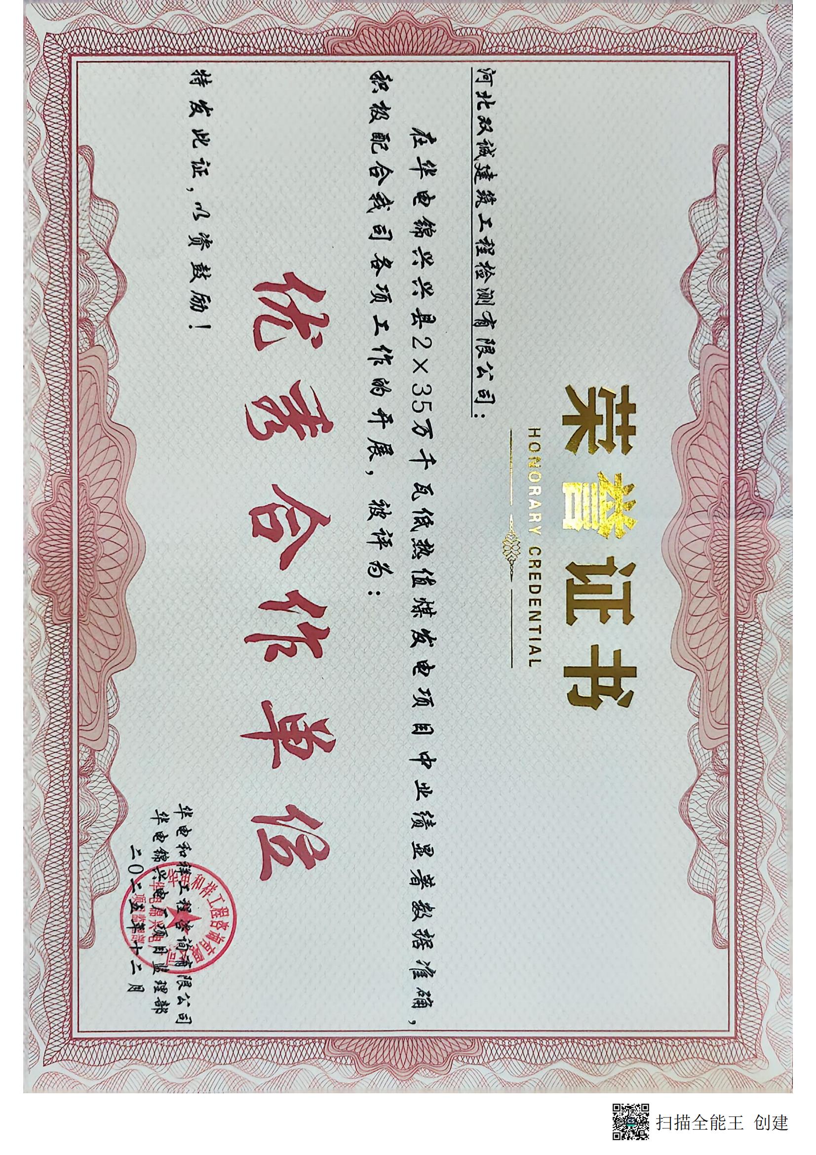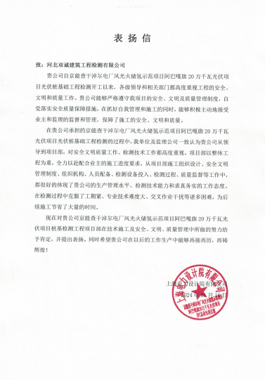 我公司致力为建设工程服务,不断提升检测效果,完成的检验检测工程项目多次获得政府各级奖励,主要有:工程勘察设计国行优工程一等奖一项、三等奖一项;省建设厅科技进步一等奖二项、二等奖一项;省优秀工程勘察设计二等奖七项、三等奖三项;国家专利四项;市优秀工程勘察设计一等奖一项、二等奖一项、三等奖一项;省优秀QC小组二等奖一项、三等奖三项、省级工法四项;主编的河北省地方标准《基桩内力测试规程》DB13(J)T 301-2019已出版发布,并连续多年评为“重合同守信用”单位,取得了较大的社会效益,树立了良好的市场形象。